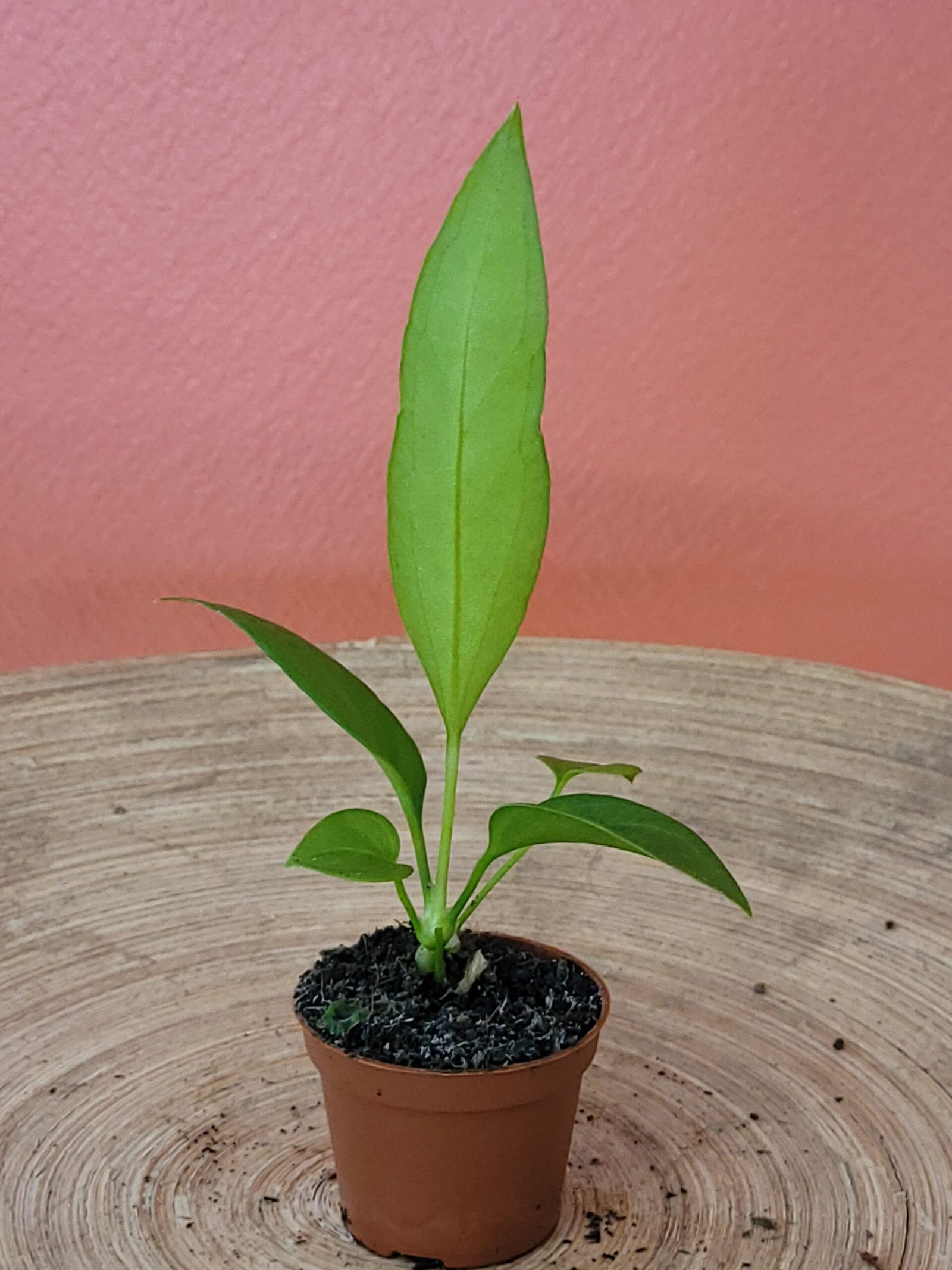 Jeune plante tropicale au feuillage fin et allongé rappelant des lanières, rare et décorative, parfaite pour collectionneurs.
